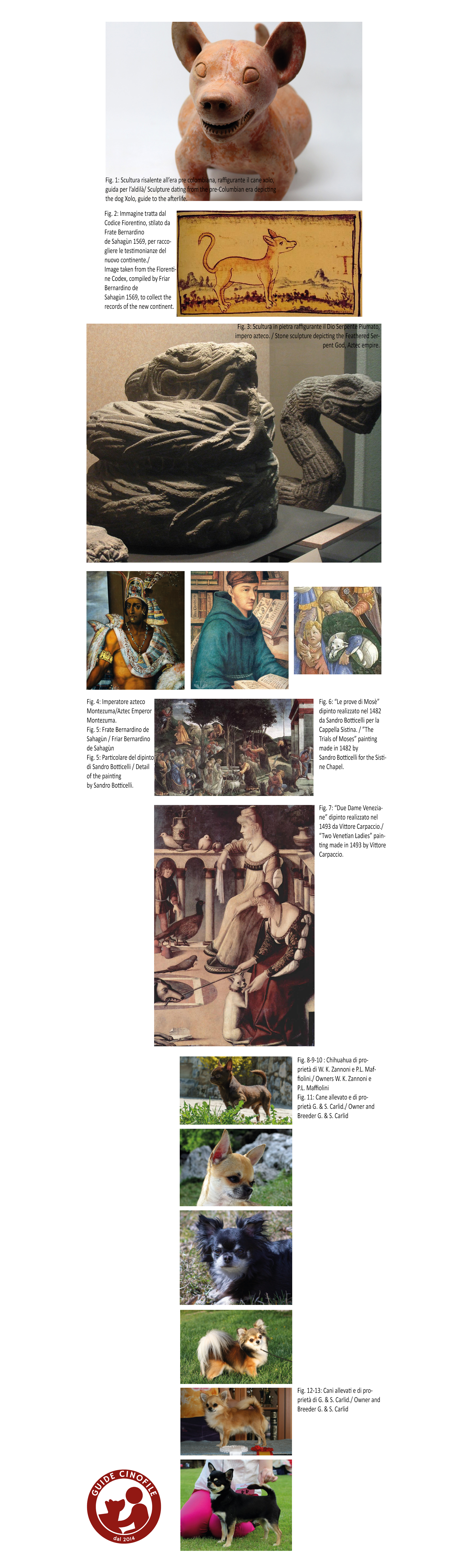 La Storia ci dice intanto che mentre tutto questo accadeva nel nuovo continente, l’Europa attraversava un periodo di consolidamento degli stati e dei governi, aveva allontanato gli spettri del Medioevo dei secoli precedenti, superando pestilenze, carestie e un insolito surriscaldamento climatico globale simile a quello che oggi stiamo vivendo. Era il 1543 e Niccolò Copernico aveva pubblicato “Le Rivoluzioni degli Astri Celesti” e nelle corti reali e salotti dell’alta borghesia piccoli cani allietavano le giornate. Ma ancora prima opere di diversi artisti tra i quali si evidenziano quelle di Sandro Botticelli nella Cappella Sistina nel 1482, sono presenti piccoli cani portati nelle borse, molto simili a quello che oggi è il Chihuahua. Questo ci fa pensare alla possibilità reale della presenza in tutta Europa di cani dalla taglia molto contenuta, si pensi ai progenitori dell’English Toy Terrier Black and Tan in Gran Bretagna o gli Epagneul nani continentali in Francia.